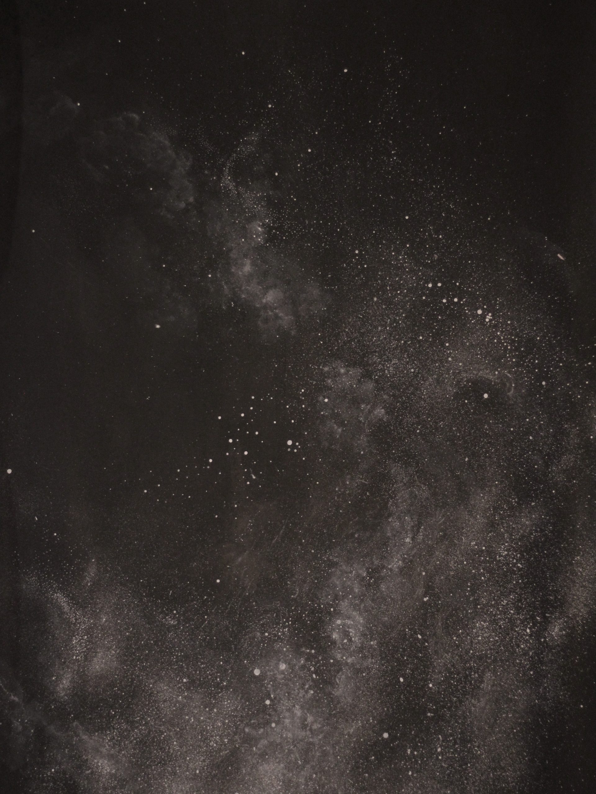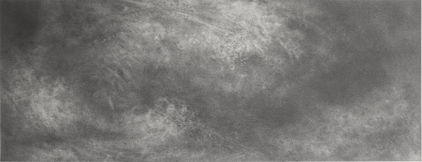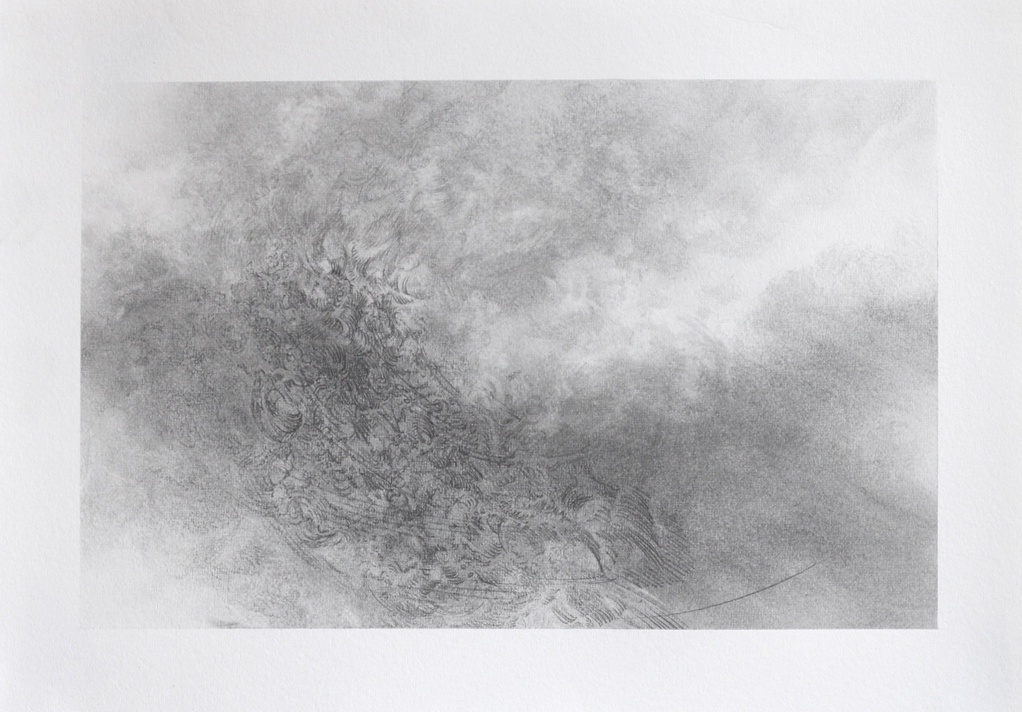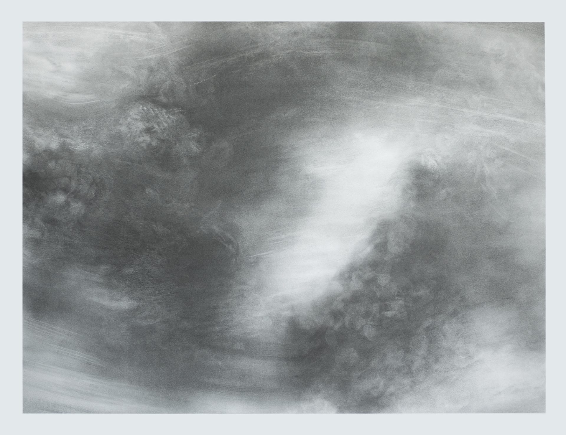 Je questionne aussi la matière par laquelle il est possible de créer une image statique qui traduit ce dynamisme, le dessin lui même, sa forme et la texture qui transmettront l’expérience, le ressenti haptique de l’image. Un ressenti où vient dialoguer la perception avec ces masses et ces rythmes. Je dessine en noir et blanc avec les moyens rudimentaires que sont le graphite et le papier. Lentement, je m’applique à inscrire des masses nébuleuses en cherchant à animer la surface plane du papier et à en activer les espaces, par des rythmes et des mouvements, sans avoir recours au mimétisme photographique.